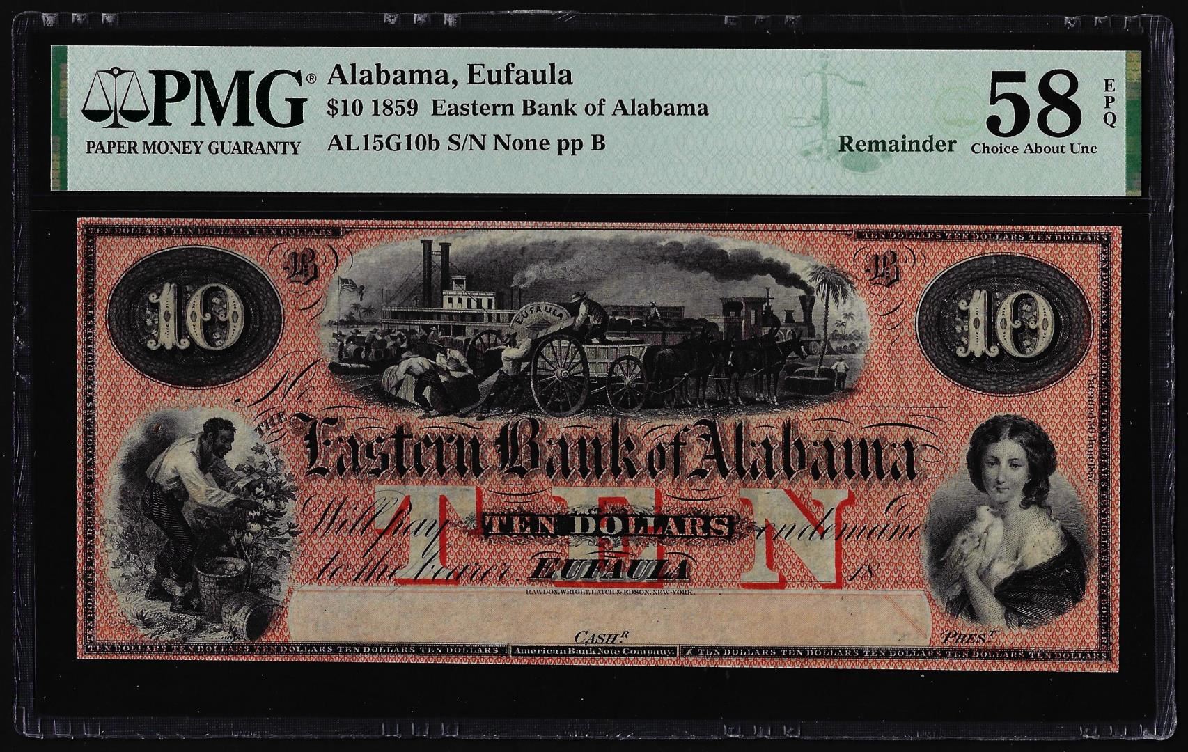 1859 $10 Eastern Bank of Alabama Obsolete Note PMG Choice About Uncirculated 58EPQ