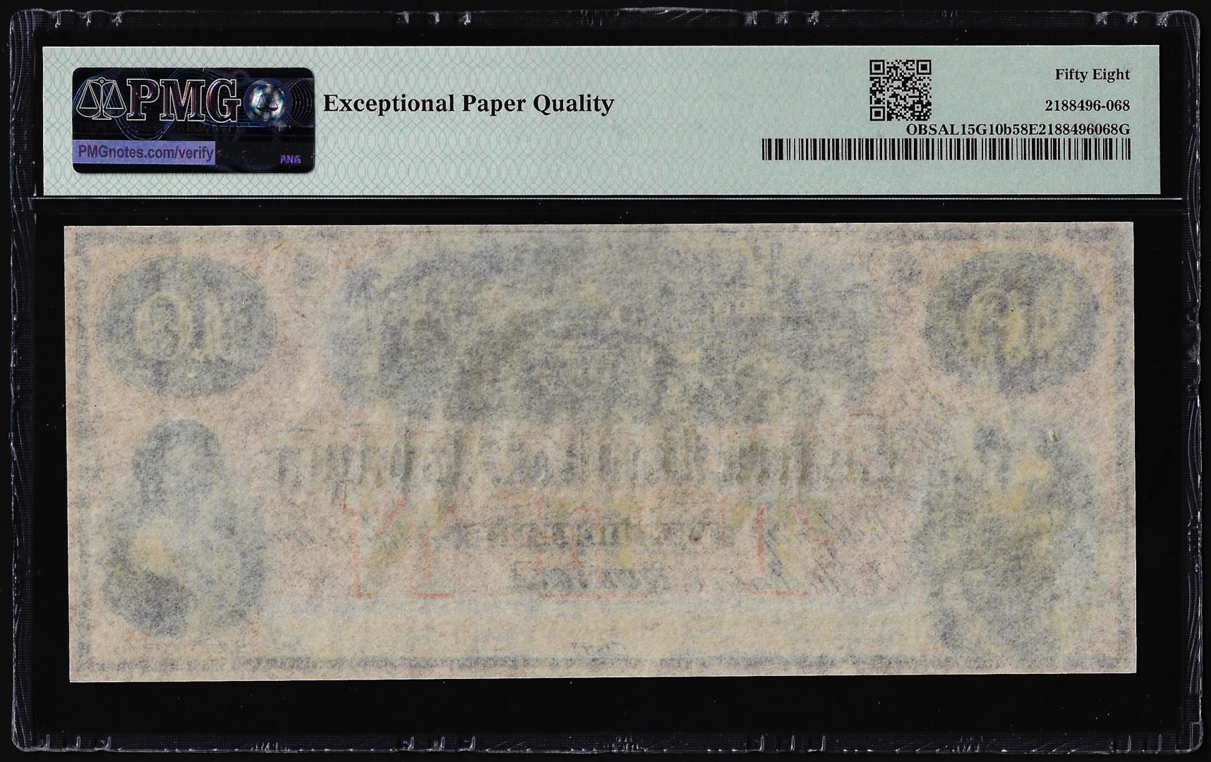 One 1859 $10 Eastern Bank of Alabama Obsolete Note PMG Choice About Uncirculated 58EPQ. PMG Certified.