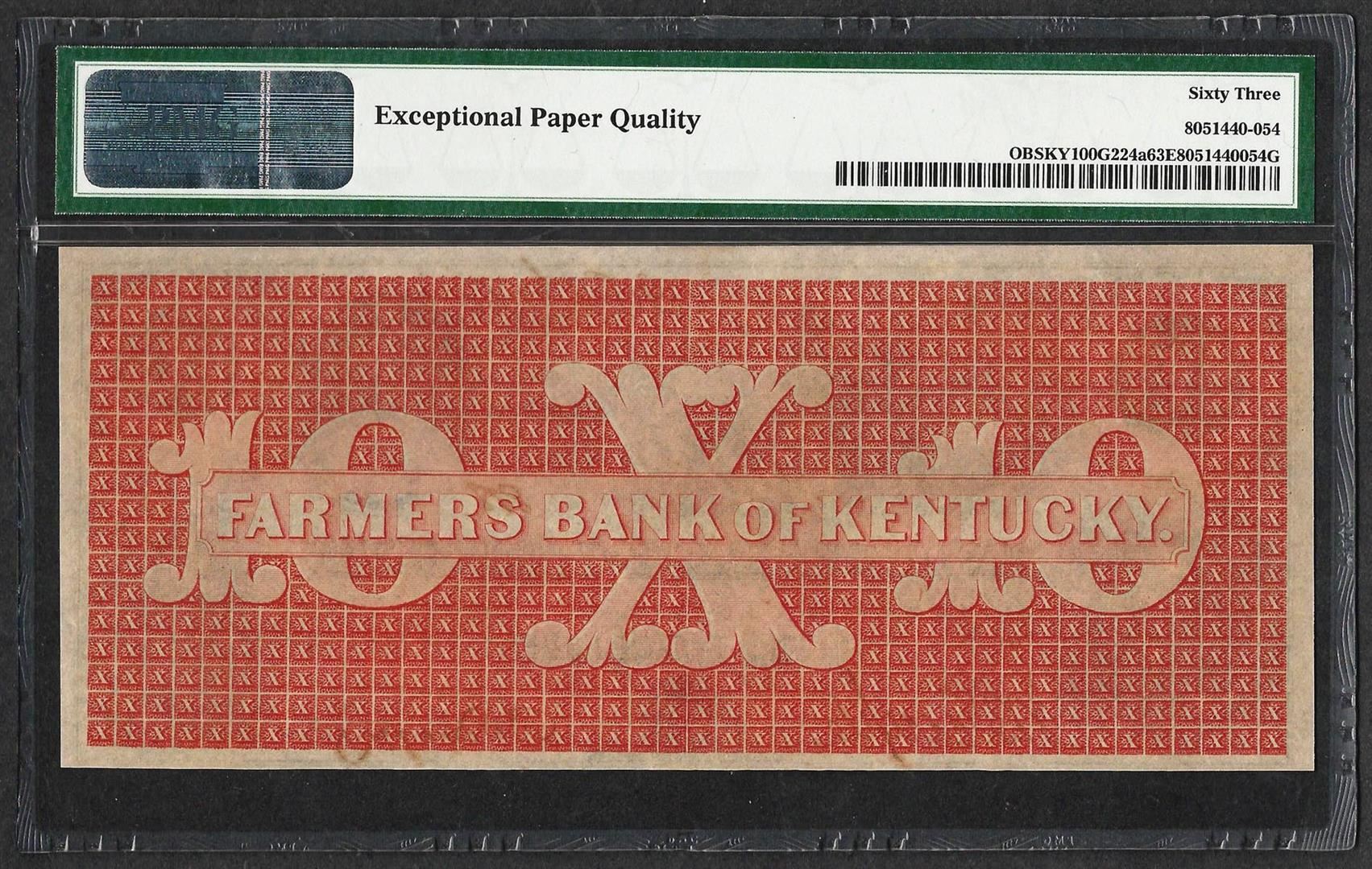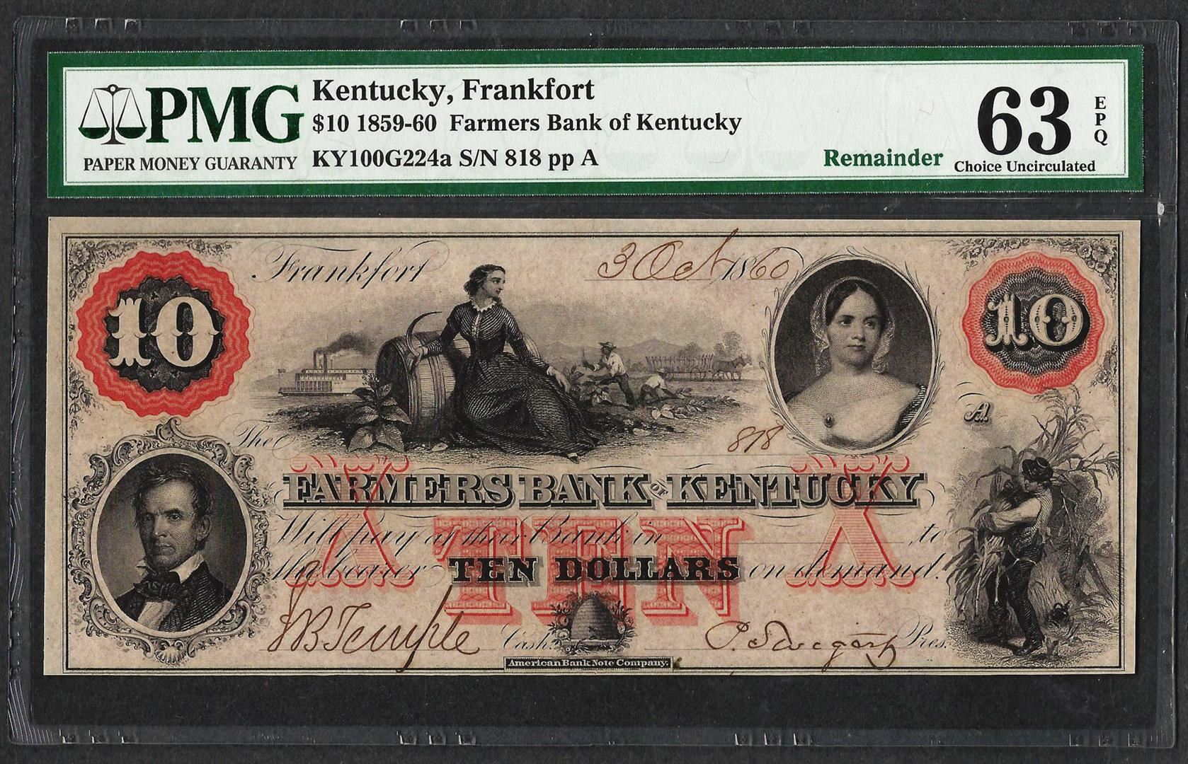 One 1859 $10 Farmers Bank of Kentucky Obsolete Note PMG Choice Uncirculated 63EPQ. PMG Certified.