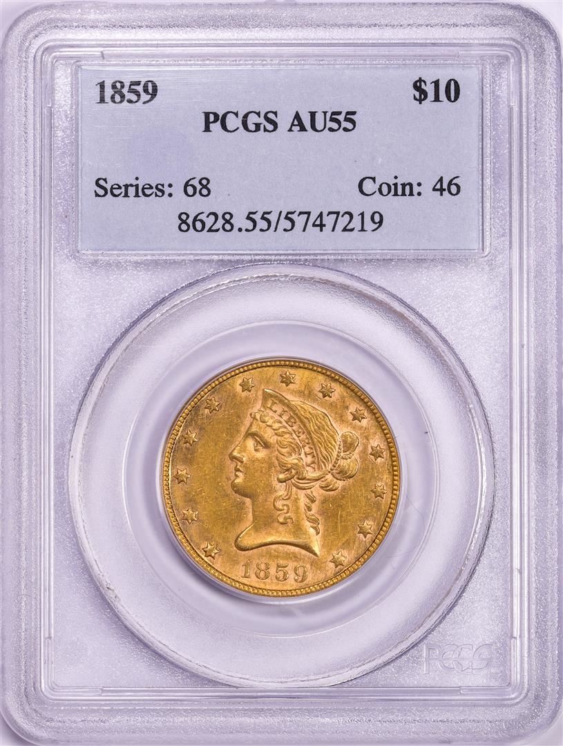 One 1859 $10 Liberty Head Eagle Gold Coin PCGS AU55. PCGS Graded.