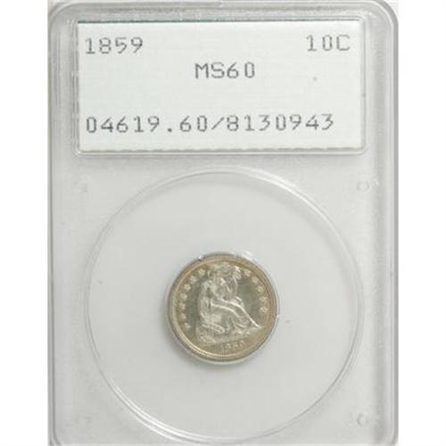 <B>1859 10C MS60 PCGS.</B></I> PCGS Population (1/90). NGC Census: (1/115). Mintage: 430,000. Numismedia Wsl. Price for NGC/PCGS coin in MS60: $215. (#4619)<BR><BR><B>Coin Engraver:</B> Christian Gobrecht<BR><BR><b>Shipping:</b> Coins & Currency (<a target="_blank" href="http://www.heritageauctions.com/common/shipping.php">view shipping information</a>)