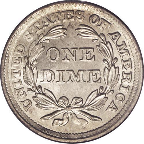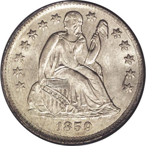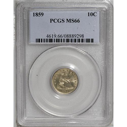 <B>1859<10C> MS66 PCGS.</B></I> Impeccable surfaces are extremely well frosted and offer a superb, lightly toned appearance over both sides. The 1859 is not a rare issue in comparison to other Stars Obverse dimes, but its importance as a type coin in this superlative condition is first and foremost. Population: 16 in 66, 13 finer (7/06).