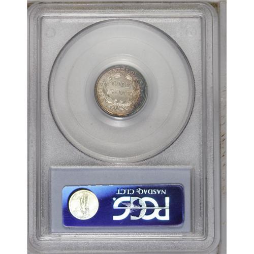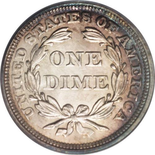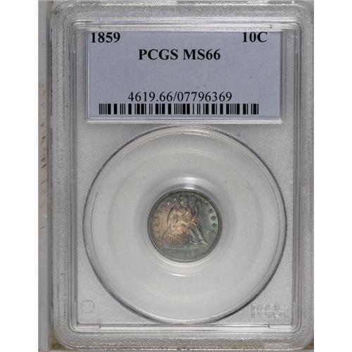 <B>1859<10C> MS66 PCGS.</B></I> It appears that a substantial number of coins from this issue were saved as the last of their kind, being from the final year of the Stars Obverse type. However, the quantity of pieces preserved in high grades is definitely lower than the number of collectors who desire high grade examples. This coin is lavishly toned in shades of purple-rose, cobalt-blue, and golden-silver, and displays bright, satiny luster that is unbroken by any noticeable abrasions. Somewhat irregularly defined, with weakness noted on the obverse stars, Liberty's head, and TED STAT. A small milling mark on Liberty's leg, just above the knee, seems insufficiently distracting to cast doubt upon the coin's Premium Gem status.