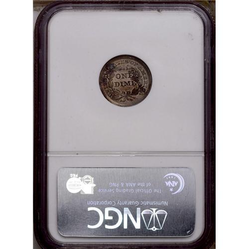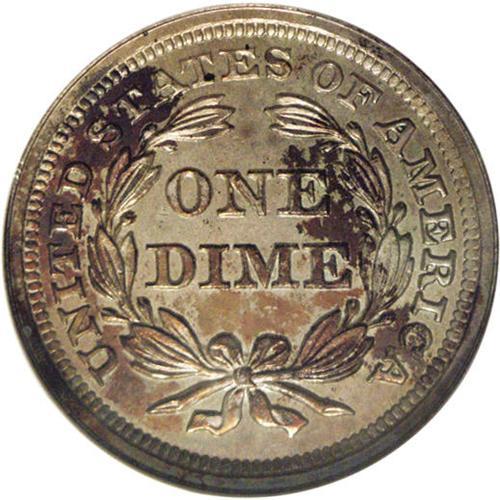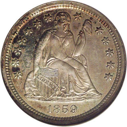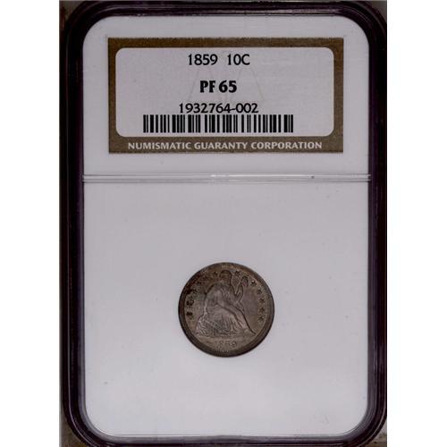<B>1859<10C> PR65 NGC.</B></I> This is the final Philadelphia Mint issue of the Stars Obverse design, although this same design was continued in San Francisco for another year due to the lack of available dies of the new Legend Obverse type. Both sides have pleasing mirrored fields with lustrous devices beneath champagne toning splashed with russet and blue color.