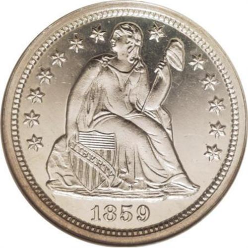 <B>1859 10C PR66 Cameo NGC.</B></I> The With Stars type is only really available in two years, 1858 and 1859; otherwise, it is rarely seen in earlier years. Only 800 proofs were struck, but far fewer have survived. In all grades and from both services around 200 pieces have been certified, both as Cameo and non-Cameo. This number helps confirm that numerous proofs remained unsold at year's end and were probably melted, as in 1860. This is a spectacular coin that has deeply reflective fields. The devices display a strong overlay of mint frost which gives the coin its cameo contrast. Census: 3 in 66, 5 finer (8/07). <BR><BR><b>Shipping:</b> Coins & Currency (<a target="_blank" href="http://www.heritageauctions.com/common/shipping.php">view shipping information</a>)