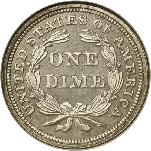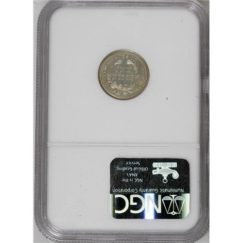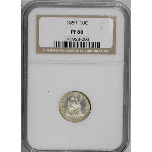 <B>1859<10C> PR66 NGC.</B></I> This is one of our favorite type coins in the Seated dime series. Stars dimes are generally only available in proof format in two years, 1858 and 1859. All the other, earlier dates cost significantly more than these two dates. The 1859 is also much scarcer than its official mintage of 800 pieces would indicate, as many were melted as unsold at year's end. This piece has hazy brilliance over each side and the fields are deeply mirrored. An outstanding example of this scarce and underrated proof issue. Census: 26 in 66, 7 finer (7/06).