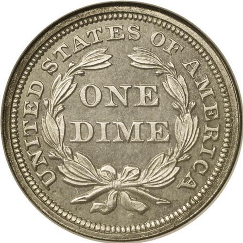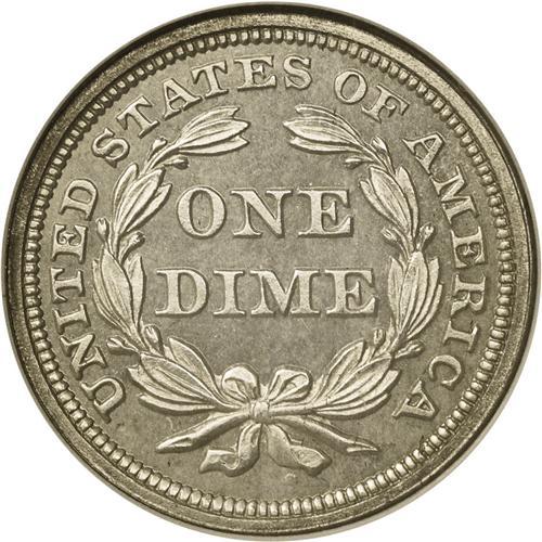 <B>1859<10C> PR66 NGC.</B></I> This is one of our favorite type coins in the Seated dime series. Stars dimes are generally only available in proof format in two years, 1858 and 1859. All the other, earlier dates cost significantly more than these two dates. The 1859 is also much scarcer than its official mintage of 800 pieces would indicate, as many were melted as unsold at year's end. This piece has hazy brilliance over each side and the fields are deeply mirrored. An outstanding example of this scarce and underrated proof issue. Census: 25 in 66, 7 finer (9/06).