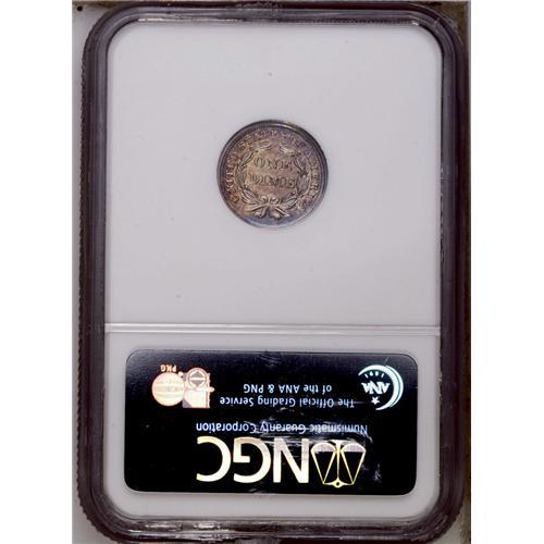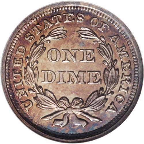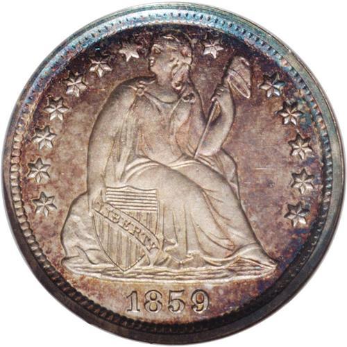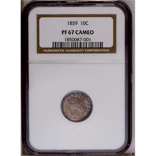<B>1859<10C> PR67 Cameo NGC.</B></I> The official mintage for the 1859 dime was 800 pieces. However, an unknown number were melted as unsold at year's end, leaving an uncertain amount that were actually sold to collectors. The 1859 is the most available proof of what is essentially a two-year type in proof format, since it was not until 1858 that the Mint began larger scale production of proof coinage for sale to collectors. This is a deeply mirrored proof striking that shows considerable mint luster over the devices even though each side is toned deep rose with cobalt-blue at the margins. Among the finest known of this year; PCGS and NGC have only certified a total of seven coins in PR67 (two PCGS, five NGC) and none are finer (3/06).