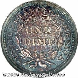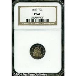 <B>1859<10C> PR67 NGC.</B></I> This Superb Gem Proof is one of the best examples certified for this date. NGC has certified a few PR67 examples, a few more with cameo contrast, and two finer PR68 coins. Even though this does not qualify as finest certified, we cannot imagine any that are more desirable. Further, this dime has excellent cameo contrast despite not carrying such a designation. The color is outstanding with iridescent toning on both sides. The obverse has rich gold color with vivid blue and lilac along the top border. The reverse has peripheral sea-green toning with lilac and rose accents. A splendid example of the final Philadelphia Mint issue of this design. <BR><BR><B>Important notice:</B> Heritage usually auctions material at the rate of 200-250 lots per hour. On some occasions eBay Live bid software or the Internet may not be able to keep up with the pace of the auction. We recommend placing a realistic absentee bid now as insurance to avoid disappointment. Occasionally the auctioneer may eliminate or reject an eBay Live bid, and the auctioneer may also reopen a lot after the close of the eBay live bidding (usually because we missed an audience bid), and may reject your bid even if it shows you as the winning bidder. By bidding via eBay Live, you agree that Heritage may award the lot to another bidder at its sole discretion under the circumstances described above or any other reasonable circumstances. Since eBay bids are not shown to us until we open the lot on the floor, we treat those bids just like floor bids. In most cases the floor responds before the eBay bid is presented to us, due to Internet lag time, so for consistency we have made it a policy that floor bids are always considered first over tie eBay live bids. Also please note that all Heritage lots purchased through eBay Live carry a 20% Buyer's Premium. Please make sure you read the Terms and Conditions before you bid.