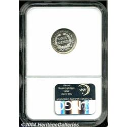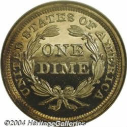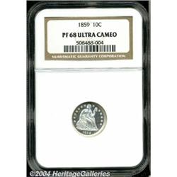<B>1859<10C> PR68 Deep Cameo NGC.</B></I> As a leading numismatic auctioneer, we have to be careful that our own sales do not give us a false sense of the availability of certain coins. Take for example the proof 1859 Seated Dime. This is a genuinely rare issue with many of the 800 coins originally produced likely having been melted as unsold at year's end. Yet, this cataloger alone has had the privilege of describing several examples over the past couple of years. On the other hand, we can also testify to the fact that the typical proof 1859 Dime is rarely going to possess the technical merits and/or eye appeal of the present Superb Gem. The deeply mirrored fields leave little doubt about this coin's proof status. In contrast, the devices are well frosted. All areas present an essentially untoned appearance with only the slightest hint of golden color at the border areas. The single finest certified Deep Cameo designated specimen at NGC (7/04). <BR><BR><B>Important notice:</B> Heritage usually auctions material at the rate of 200-250 lots per hour. On some occasions eBay Live bid software or the Internet may not be able to keep up with the pace of the auction. We recommend placing a realistic absentee bid now as insurance to avoid disappointment. Occasionally the auctioneer may eliminate or reject an eBay Live bid, and the auctioneer may also reopen a lot after the close of the eBay live bidding (usually because we missed an audience bid), and may reject your bid even if it shows you as the winning bidder. By bidding via eBay Live, you agree that Heritage may award the lot to another bidder at its sole discretion under the circumstances described above or any other reasonable circumstances. Since eBay bids are not shown to us until we open the lot on the floor, we treat those bids just like floor bids. In most cases the floor responds before the eBay bid is presented to us, due to Internet lag time, so for consistency we have made it a policy that floor bids are always considered first over tie eBay live bids. Also please note that all Heritage lots purchased through eBay Live carry a 20% Buyer's Premium. Please make sure you read the Terms and Conditions before you bid. </span></font></tr></table></td></tr></table>