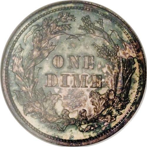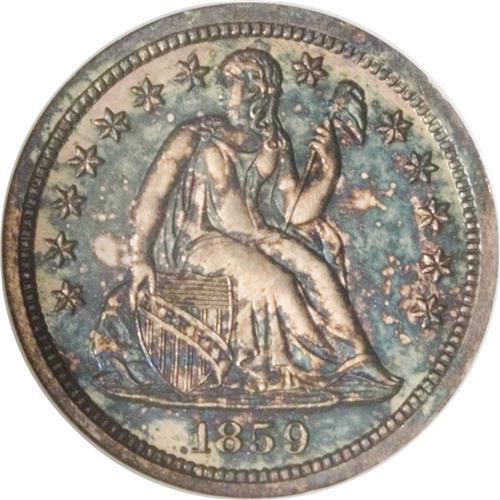 <B>1859 10C Transitional PR65 NGC.</B></I> Judd-233, High R.6. Popularly known as "The Coin Without a Country," as the starred obverse used for regular issue 1838-1859 dimes is combined with the cereal wreath reverse of 1860-1891 issues, with no indication anywhere of the country of origin. USpatterns.com characterizes this coin as a "fantasy" and states, "It is believed that fewer than two dozen are known." This curious piece has long been listed in the <I>Guide Book,</B></I> and as such is very popular today. This coin is deeply toned in shades of indigo and burgundy above fully reflective surfaces which instantly betray its status as a proof. A bit of lighter silver color is visible on the obverse figure of Liberty. Heavy die polish lines are visible in the fields, yet actual contact marks appear to be limited to a few minor pinpricks. This is an appealing example of this numismatically fascinating issue. <BR><I>From The Southland Collection.</B></I><BR><BR><b>Shipping:</b> Coins & Currency (<a target="_blank" href="http://www.heritageauctions.com/common/shipping.php">view shipping information</a>)