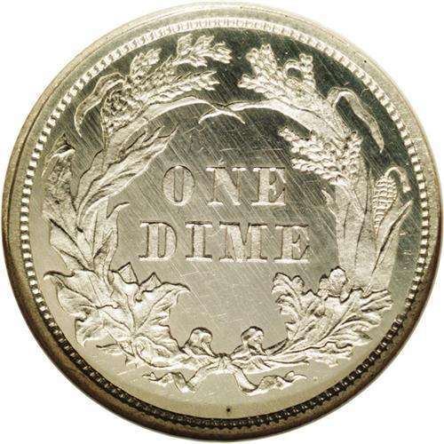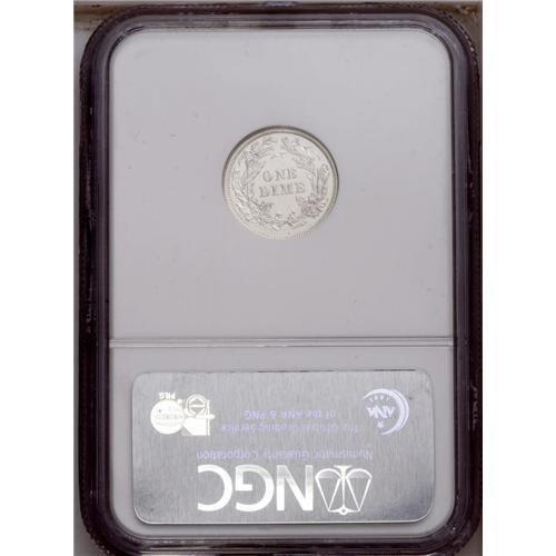<B>1859<10C> Transitional PR65 NGC.</B></I> Under the directorship of James Ross Snowden the Mint was able to greatly expand The Mint Collection of rare coins (now in the Smithsonian). However, in order to obtain these rarities Snowden produced a number of unusual pieces, sometimes known as "trade bait." The transitional 1859 dimes and 1860 half dimes are such coins. The dimes were produced at a time when new hubs were being prepared for the Legend Obverse design that started in 1860. He married an old With Stars obverse with the new "Cereal Wreath" reverse. An oddity for certain, these coins make no mention of the United States, and have from time to time been called "The Coin Without a Country." These coins have traditionally been listed in pattern references; this issue is listed as a Judd-233. Allegedly only 12 pieces were struck, all proofs. This example is absolutely white on each side. The fields are deeply reflective with heavy die striations on each side, and there is a noticeable amount of mint frost over the devices. Undoubtedly, one of the finest examples known of this curious issue.