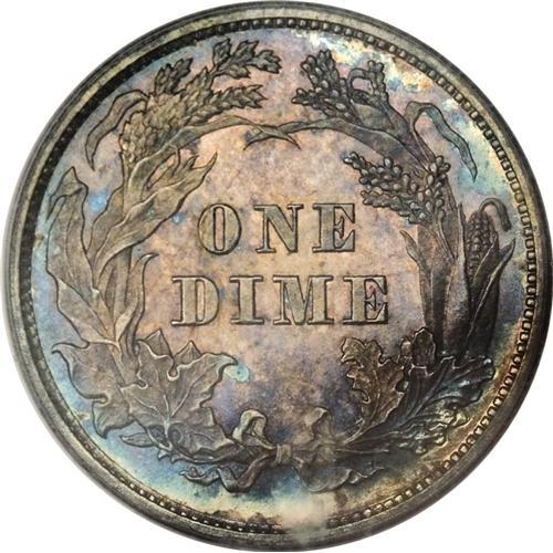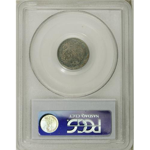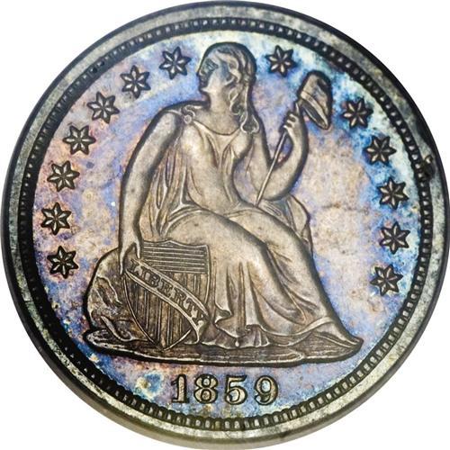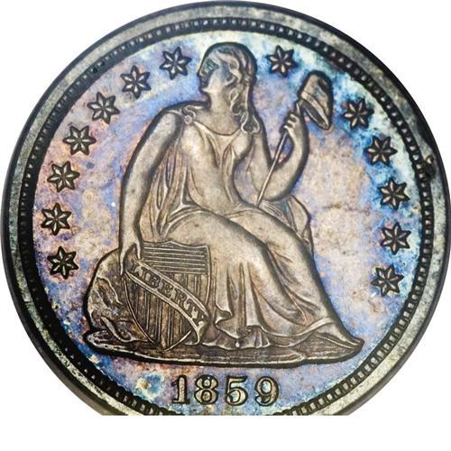 <B>1859 10C Transitional PR65 PCGS.</B></I> The "coin without a country," produced at a time when the Mint, under the directorship of James Ross Snowden, was moving the legend UNITED STATES OF AMERICA from the reverse to the obverse, eventually also eliminating the stars on the obverse from the final design adopted. Technically a pattern (Judd-233), but often collected along with the regular issues, and listed in the <I>Guide Book,</B></I> increasing its popularity with collectors. Here the stars are still present, but the reference to the fatherland is absent. Silver-lilac centers meld into iridescent blue and magenta at the peripheries. Population: 2 in 65, 2 finer (11/06).<BR><BR><b>Shipping:</b> Coin/Currency (<a target="_blank" href="http://www.heritageauctions.com/common/shipping.php">view shipping information</a>)