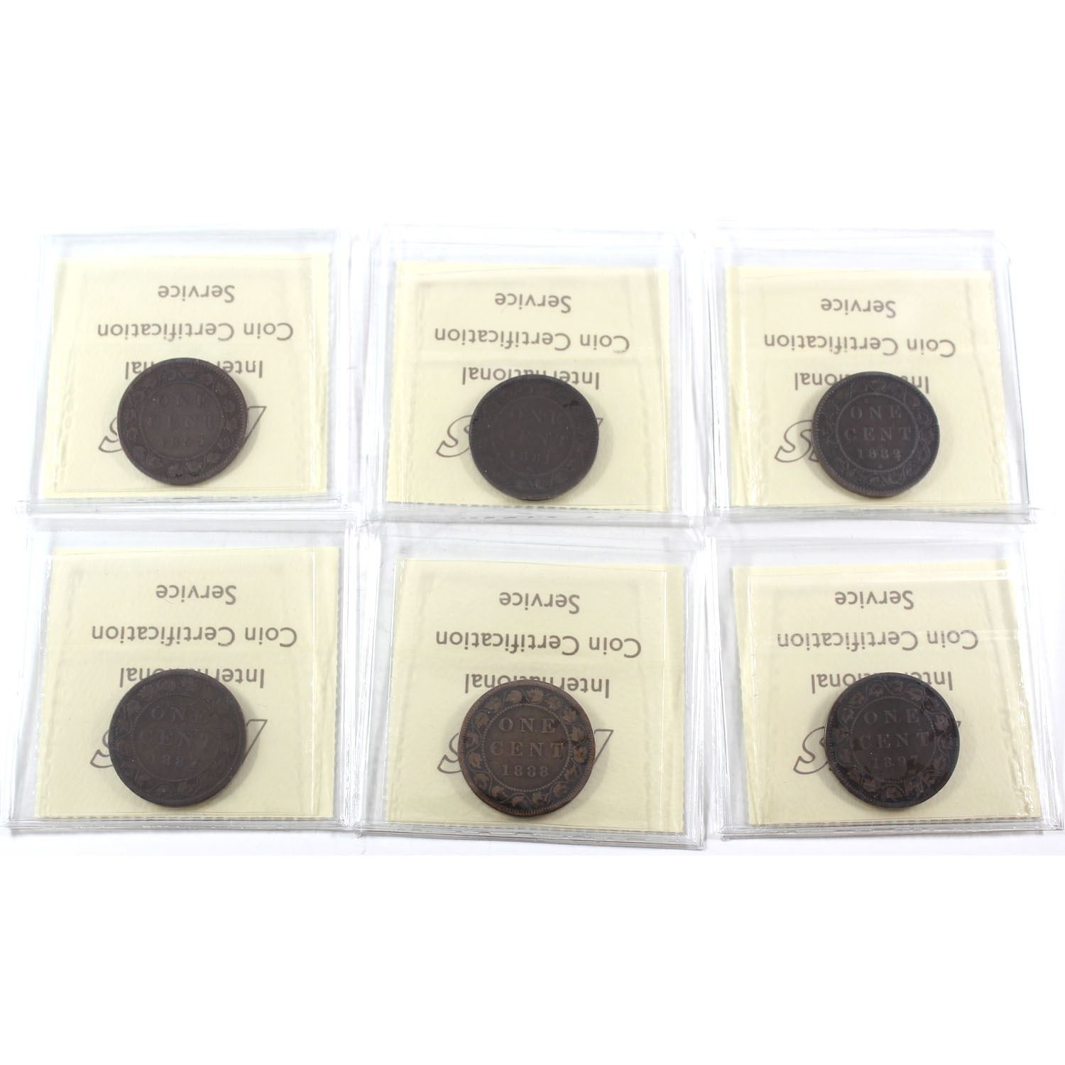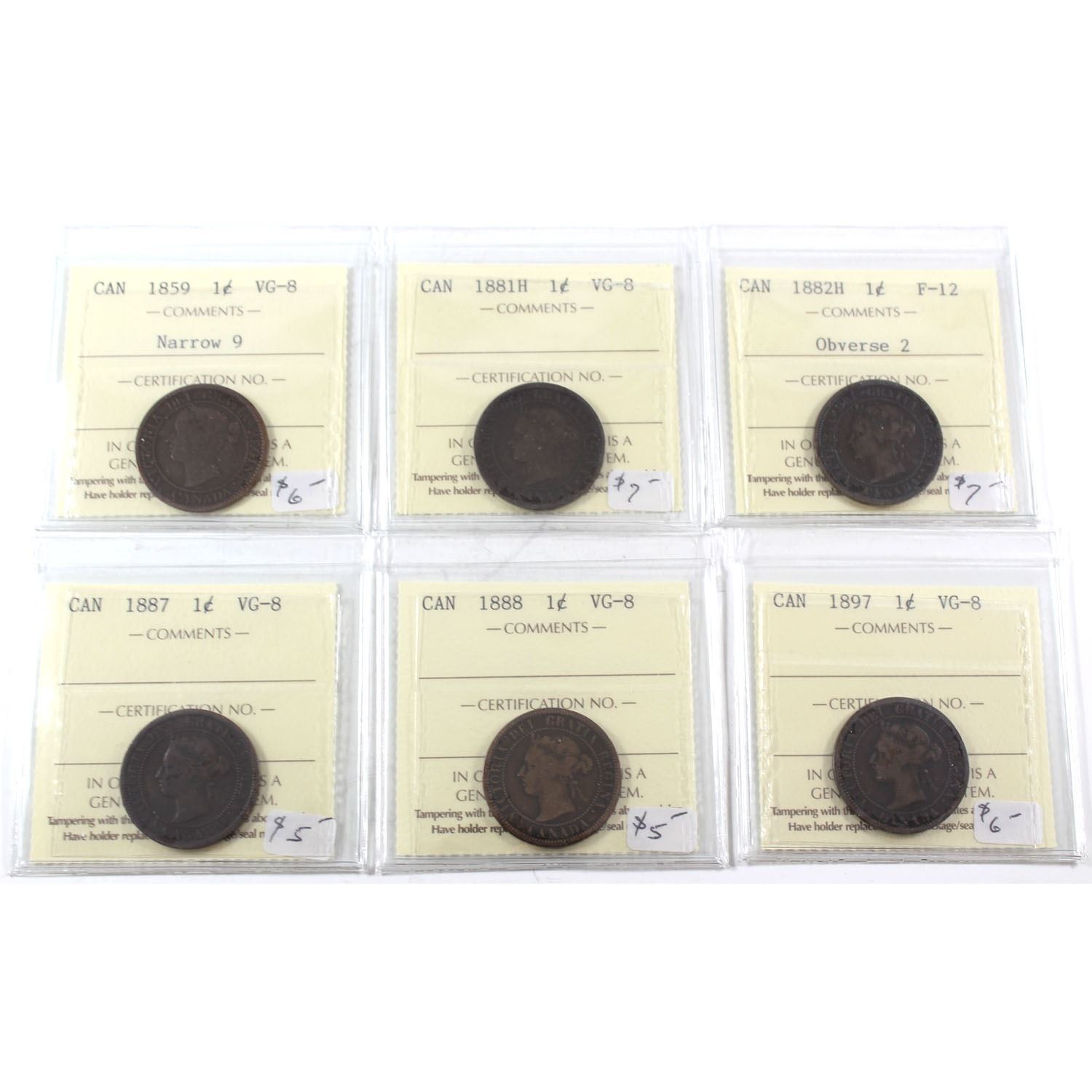 1859-1897 Canada 1-cent ICCS Certified - 1859 Narrow 9 VG-8, 1881H VG-8, 1882H Obverse 2 F-12, 1887 VG-8, 1888 VG-8 & 1897 VG-8. 6pcs