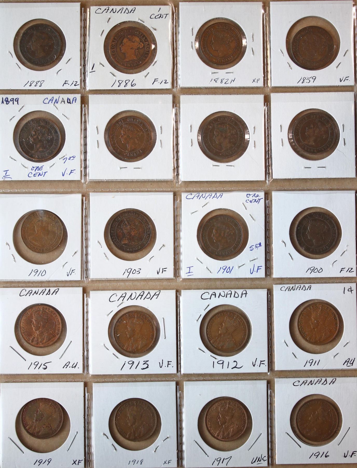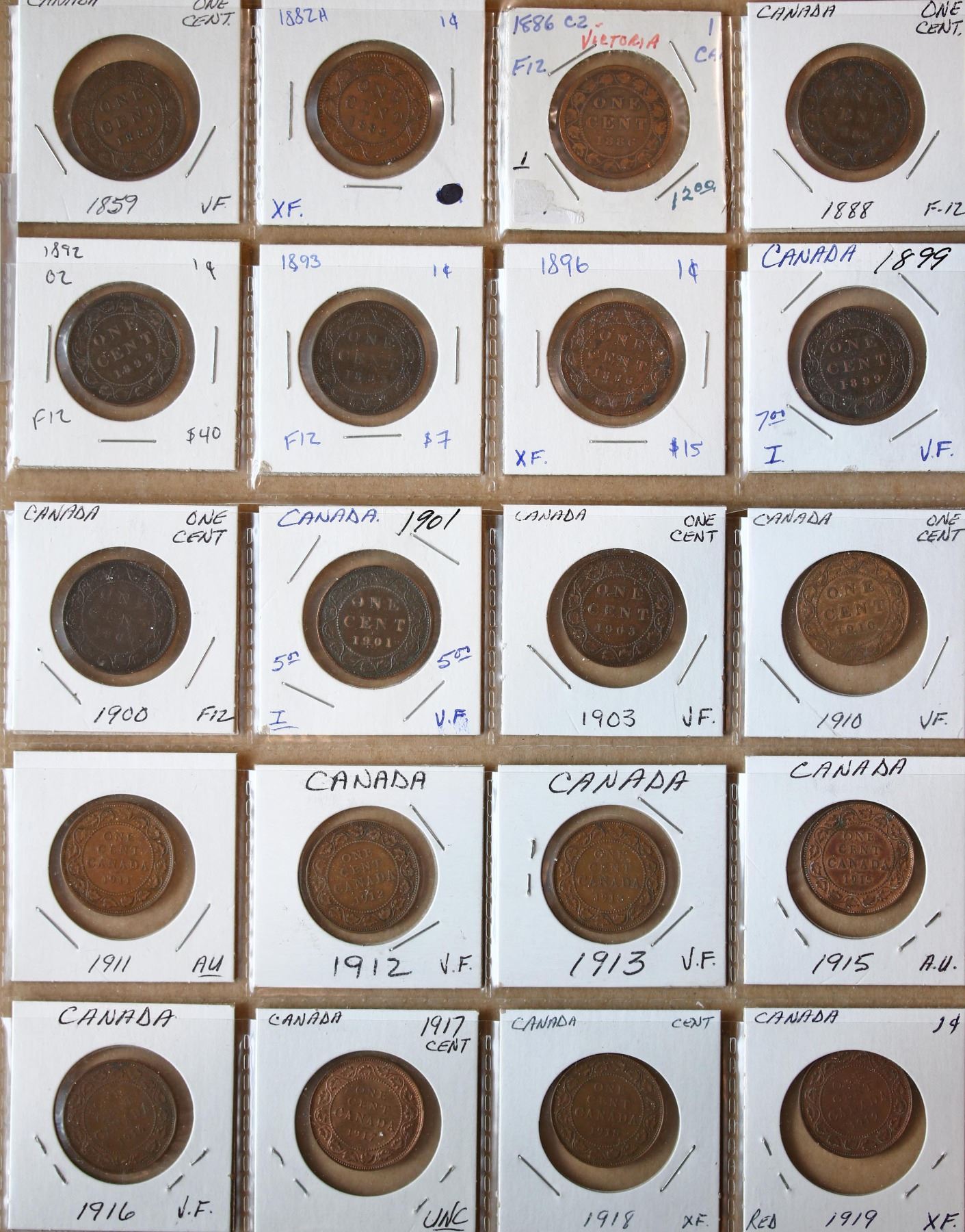1859-1919 1¢, lot of 20 coins. Grades vary from VG to UNC.