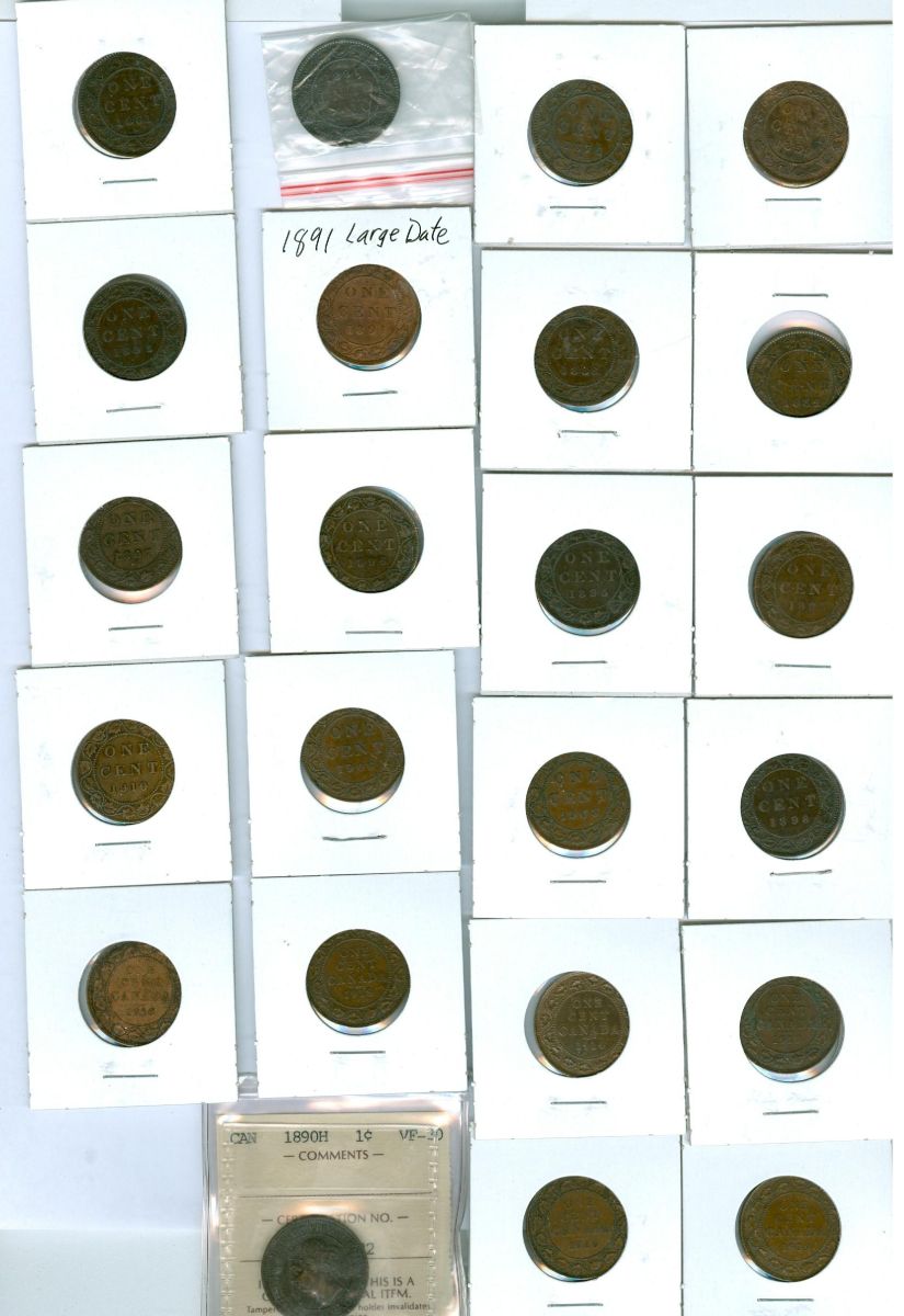 1859-1920 1¢. Lot of 23 large cents. Includes 13 x Victorian, 3 x Edward and 6 x George V. Dates include 1859, 1876H, 1881H(2), 1882H, 1888, 1891 LD LL, 1892, 1893, 1895, 1896, 1897, 1898H, 1903, 1906, 1910, 1913, 1914, 1918(2), 1919 and 1920. Coins grade F to EF with the majority of the Vicky examples being VF to EF. Also includes 1 x 1890H ICCS VF30 1¢.
