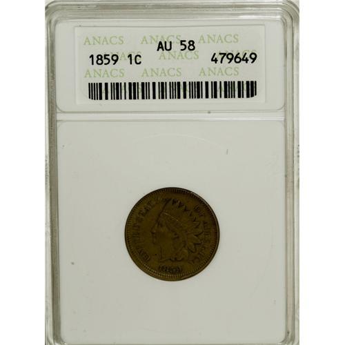 <B>1859 1C AU58 ANACS.</B></I> NGC Census: (142/1994). PCGS Population (121/1203). Mintage: 36,400,000. Numismedia Wsl. Price for NGC/PCGS coin in AU58: $158. (#2052)<BR><BR><b>Shipping:</b> Coins & Currency (<a target="_blank" href="http://www.heritageauctions.com/common/shipping.php">view shipping information</a>)
