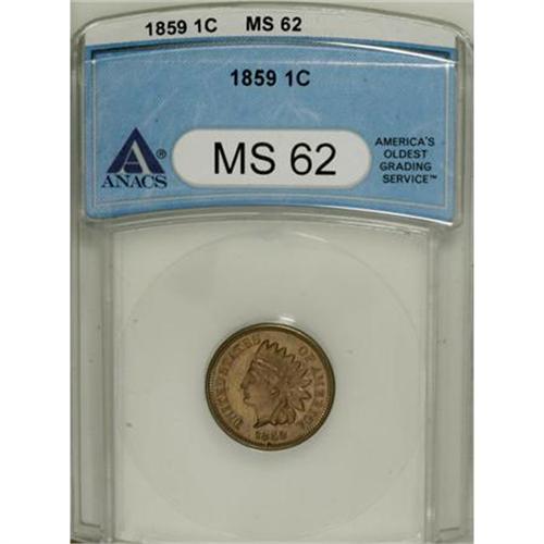 <B>1859 1C MS62 ANACS.</B></I> NGC Census: (126/828). PCGS Population (139/1042). Mintage: 36,400,000. Numismedia Wsl. Price for NGC/PCGS coin in MS62: $240. (#2052)<BR><BR><B>Coin Engraver:</B> James B. Longacre<BR><BR><b>Shipping:</b> Coins & Currency (<a target="_blank" href="http://www.heritageauctions.com/common/shipping.php">view shipping information</a>)