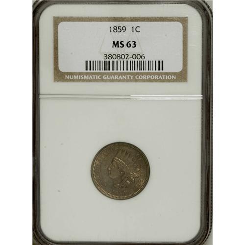 <B>1859 1C MS63 NGC.</B></I> NGC Census: (234/580). PCGS Population (420/609). Mintage: 36,400,000. Numismedia Wsl. Price for NGC/PCGS coin in MS63: $400. (#2052)<BR><BR><b>Shipping:</b> Coins & Currency (<a target="_blank" href="http://www.heritageauctions.com/common/shipping.php">view shipping information</a>)