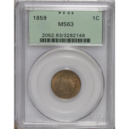 <B>1859 1C MS63 PCGS.</B></I> PCGS Population (422/601). NGC Census: (468/1162). Mintage: 36,400,000. Numismedia Wsl. Price for NGC/PCGS coin in MS63: $400. (#2052)<BR><BR><b>Shipping:</b> Coins & Currency (<a target="_blank" href="http://www.heritageauctions.com/common/shipping.php">view shipping information</a>)