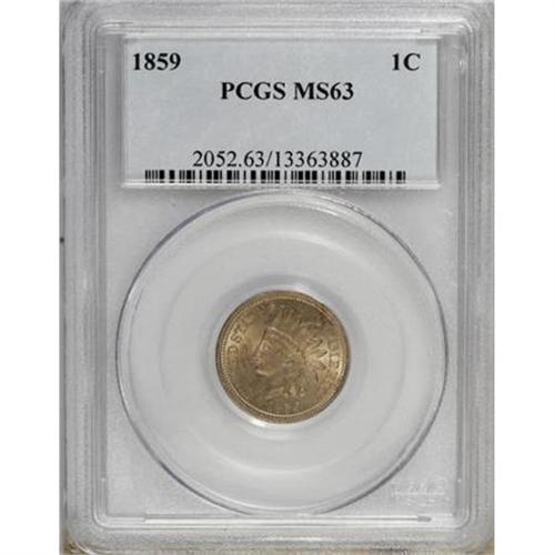 <B>1859 1C MS63 PCGS.</B></I> PCGS Population (429/633). NGC Census: (244/585). Mintage: 36,400,000. Numismedia Wsl. Price for NGC/PCGS coin in MS63: $480. (#2052)<BR><BR><B>Coin Engraver:</B> James B. Longacre<BR><BR><b>Shipping:</b> Coins & Currency (<a target="_blank" href="http://www.heritageauctions.com/common/shipping.php">view shipping information</a>)