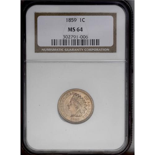 <B>1859<1C> MS64 NGC.</B></I> A lustrous near-Gem with pinpoint-sharp devices and only slight softness of strike on the dentils. Clean for the grade, and popular as a single-year type. The obverse exhibits a wire rim.
