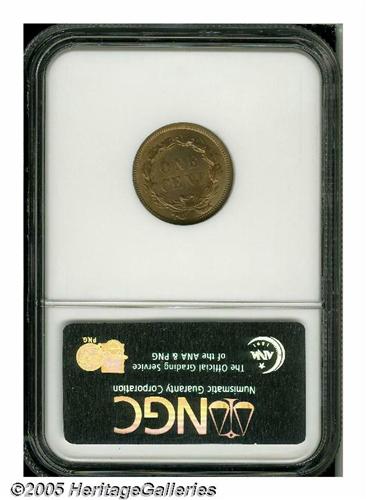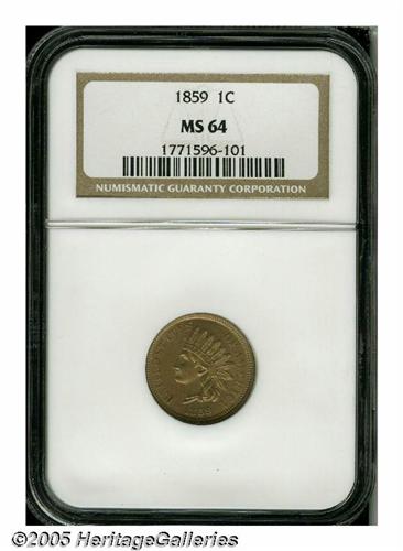 <B>1859<1C> MS64 NGC.</B></I> An intricately struck and satiny near-Gem from the introductory year of commercial Indian Cent production. A couple of faint ticks on the left obverse field prevent an even higher grade.