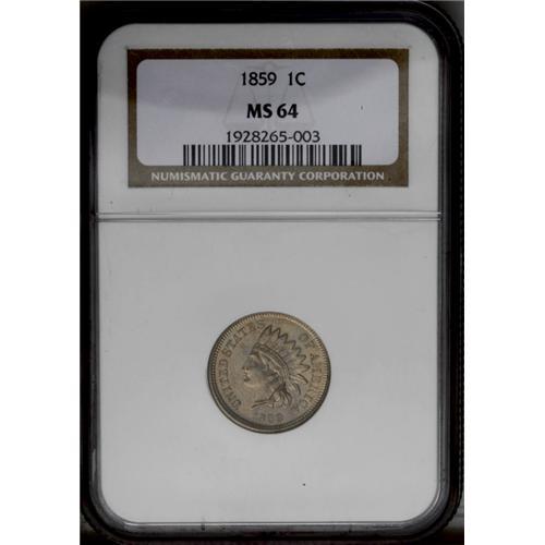 <B>1859<1C> MS64 NGC.</B></I> Generally light in color, closely resembling the old "white cent" cataloging term. with dappled steel-violet and apricot overtones on the obverse and a more subdued reverse. <BR><BR><B>Important notice:</B> Heritage usually auctions material at the rate of 200-250 lots per hour. On some occasions eBay Live bid software or the Internet may not be able to keep up with the pace of the auction. We recommend placing a realistic absentee bid now as insurance to avoid disappointment. Occasionally the auctioneer may eliminate or reject an eBay Live bid, and the auctioneer may also reopen a lot after the close of the eBay live bidding (usually because we missed an audience bid), and may reject your bid even if it shows you as the winning bidder. By bidding via eBay Live, you agree that Heritage may award the lot to another bidder at its sole discretion under the circumstances described above or any other reasonable circumstances. Since eBay bids are not shown to us until we open the lot on the floor, we treat those bids just like floor bids. In most cases the floor responds before the eBay bid is presented to us, due to Internet lag time, so for consistency we have made it a policy that floor bids are always considered first over tie eBay live bids. Also please note that all Heritage lots purchased through eBay Live carry a 20% Buyer's Premium. Please make sure you read the Terms and Conditions before you bid. This lot is being auctioned in conjunction with a live floor auction by Heritage Galleries & Auctioneers. All final auction and invoice information will be supplied by Heritage Galleries & Auctioneers, and all other information should be considered preliminary. Lot:365 <BR><BR><B>Winning Notification and Billing:</B> After the FINAL session in this auction is complete, Heritage will send e-mail and snail mail invoices. This process normally takes several days. All final auction and invoice information will be supplied by Heritage Galleries & Auctioneers, and all other information should be considered preliminary. <BR><BR>This auction will be conducted on a live auction floor and over the Internet through eBay Live. If you choose to place an absentee bid, please take a moment to <font color='#0000ff'><u><a href='http://pages.ebay.com/liveauctions/help/before/laabsentee.html'>learn how eBay Live absentee bidding works</a></u></font><font color='#000000'>