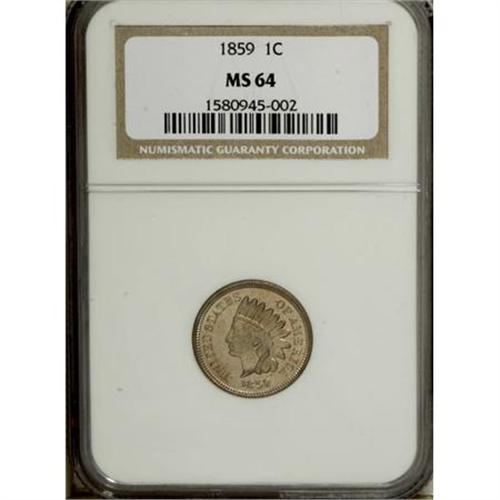 <B>1859 1C MS64 NGC.</B></I> This is a visually enchanting near-Gem example of the first Indian cent issue. In addition to its status as a first-year issue, the piece also represents the unique Laurel Wreath reverse type, which was only produced in 1859. This example is boldly struck, showing the usual softness of definition on the tips of the headdress feathers. Lustrous with even tan coloration and minimal contact marks. <BR><I>From The Laguna Niguel Collection, Part Two.</B></I><BR><BR><B>Coin Engraver:</B> James B. Longacre<BR><BR><b>Shipping:</b> Coins & Currency (<a target="_blank" href="http://www.heritageauctions.com/common/shipping.php">view shipping information</a>)