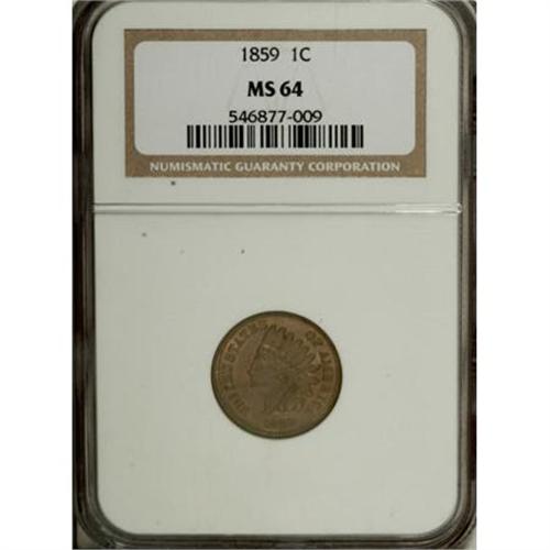 <B>1859 1C MS64 NGC.</B></I> Gold-tan patina covers each side of this near-Gem cent. The design elements are well struck, save for the usual minor softness on a couple of the diamonds. A few minuscule marks limit the grade.<BR><BR><B>Coin Engraver:</B> James B. Longacre<BR><BR><b>Shipping:</b> Coins & Currency (<a target="_blank" href="http://www.heritageauctions.com/common/shipping.php">view shipping information</a>)