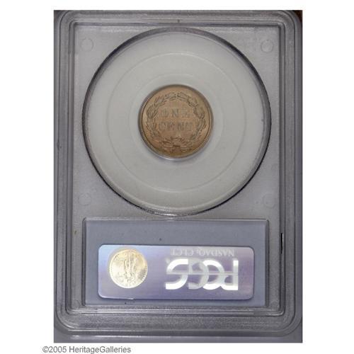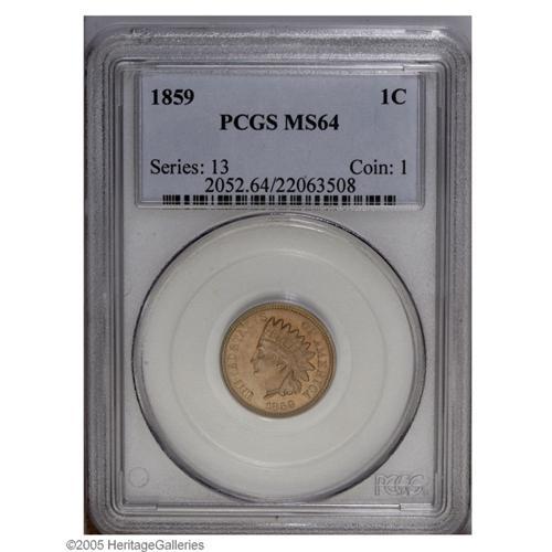 1859 1C MS64 PCGS. A sharp strike, except on TATE, for 1859[1C] MS64 PCGS.