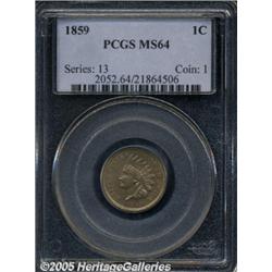 <B>1859 1C MS64 PCGS.</B></I> Attractive tan-gold patination embraces lustrous surfaces. Some tiny marks on the Indian's cheek limit the grade.
