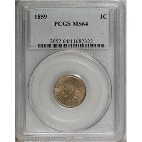 <B>1859 1C MS64 PCGS.</B></I> A lovely representative of this one-year type, Choice with pale straw-gold surfaces overall and a splash of deeper color at the STA of STATES. Few flaws are evident on the well struck obverse, though a handful of abrasions in the reverse fields preclude a finer grade.<BR><BR><b>Shipping:</b> Coins & Currency (<a target="_blank" href="http://www.heritageauctions.com/common/shipping.php">view shipping information</a>)