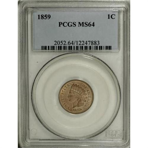 <B>1859 1C MS64 PCGS.</B></I> Salmon and lavender shades grace the luminous surfaces of this first-year near-Gem. Well-defined with a remarkably attractive appearance for the grade assigned.<BR><BR><B>Coin Engraver:</B> James B. Longacre<BR><BR><b>Shipping:</b> Coins & Currency (<a target="_blank" href="http://www.heritageauctions.com/common/shipping.php">view shipping information</a>)