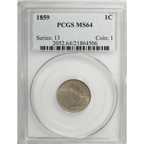 <B>1859 1C MS64 PCGS.</B></I> Attractive tan-gold patination embraces lustrous surfaces. Some tiny marks on the Indian's cheek limit the grade.<BR><BR><B>Coin Engraver:</B> James B. Longacre<BR><BR><b>Shipping:</b> Coins & Currency (<a target="_blank" href="http://www.heritageauctions.com/common/shipping.php">view shipping information</a>)