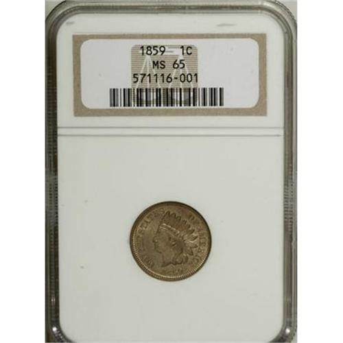 <B>1859 1C MS65 NGC.</B></I> Satiny and well detailed, with a uniform honey-tan appearance that is made even more pleasing by the coin's almost total absence of surface marks. A few flecks of carbon on the right side of the obverse seem to be the only grade-limiting factor on this lovely one-year type coin.<I><BR>From The Santa Fe Collection.</B></I><BR><BR><B>Coin Engraver:</B> James B. Longacre<BR><BR><b>Shipping:</b> Coins & Currency (<a target="_blank" href="http://www.heritageauctions.com/common/shipping.php">view shipping information</a>\)