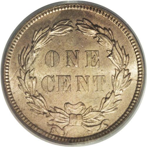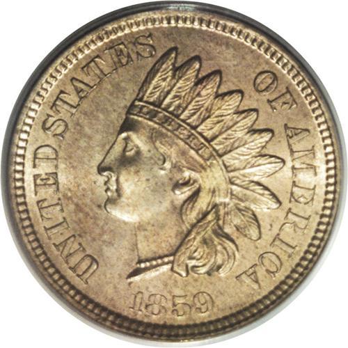 <B>1859<1C> MS65 PCGS.</B></I> A pleasing tan-gold Gem representative of this issue, technically a one-year subtype, with a pointed bust and a laurel wreath on the reverse. This pretty example boasts an incredibly sharp strike, with all four ribbon diamonds plain and each feather tip crisply delineated. Good luster radiates from each side, and there are only light flecks noted under a glass. PCGS has graded 15 pieces finer (9/06).
