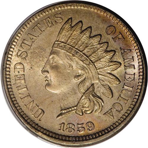 <B>1859 1C MS65 PCGS.</B></I> A radiant example with excellent sharpness on the headdress and blushes of golden-orange patina surrounding the portrait and over the entire reverse. Important one-year type and an issue that is quite elusive any finer. PCGS has only certified 15 higher quality examples of this date (2/07).<BR><BR><b>Shipping:</b> Coins & Currency (<a target="_blank" href="http://www.heritageauctions.com/common/shipping.php">view shipping information</a>)