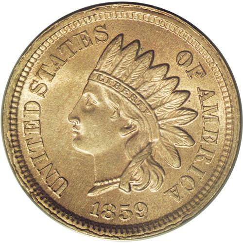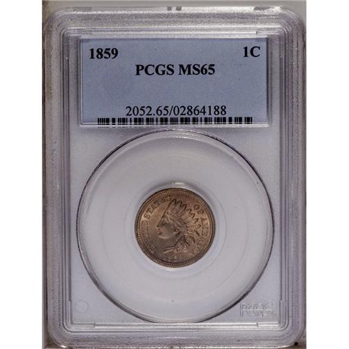 <B>1859<1C> MS65 PCGS.</B></I> Bright mint luster and pale rose-tan color characterize this exceptional 1859 Indian cent, an important one-year type coin. Fully struck as well, there are no obvious or distracting abrasions on either side of this lovely Gem. Population: 109 in 65, 14 finer (3/06). <BR><BR><B>Important notice:</B> Heritage usually auctions material at the rate of 200-250 lots per hour. On some occasions eBay Live bid software or the Internet may not be able to keep up with the pace of the auction. We recommend placing a realistic absentee bid now as insurance to avoid disappointment. Occasionally the auctioneer may eliminate or reject an eBay Live bid, and the auctioneer may also reopen a lot after the close of the eBay live bidding (usually because we missed an audience bid), and may reject your bid even if it shows you as the winning bidder. By bidding via eBay Live, you agree that Heritage may award the lot to another bidder at its sole discretion under the circumstances described above or any other reasonable circumstances. Since eBay bids are not shown to us until we open the lot on the floor, we treat those bids just like floor bids. In most cases the floor responds before the eBay bid is presented to us, due to Internet lag time, so for consistency we have made it a policy that floor bids are always considered first over tie eBay live bids. Also please note that all Heritage lots purchased through eBay Live carry a 20% Buyer's Premium. Please make sure you read the Terms and Conditions before you bid. This lot is being auctioned in conjunction with a live floor auction by Heritage Galleries & Auctioneers. All final auction and invoice information will be supplied by Heritage Galleries & Auctioneers, and all other information should be considered preliminary. Lot:366 <BR><BR><B>Winning Notification and Billing:</B> After the FINAL session in this auction is complete, Heritage will send e-mail and snail mail invoices. This process normally takes several days. All final auction and invoice information will be supplied by Heritage Galleries & Auctioneers, and all other information should be considered preliminary. <BR><BR>This auction will be conducted on a live auction floor and over the Internet through eBay Live. If you choose to place an absentee bid, please take a moment to <font color='#0000ff'><u><a href='http://pages.ebay.com/liveauctions/help/before/laabsentee.html'>learn how eBay Live absentee bidding works</a></u></font><font color='#000000'>