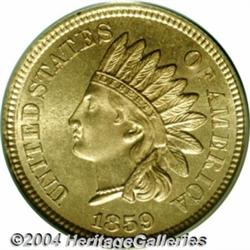 <B>1859<1C> MS65 PCGS.</B></I> Breen-1944. Sharply defined with golden-rose highlights in the fields. Close examination reveals some microscopic carbon flecks on both sides, but these are tiny indeed and do not detract from the overall appearance of the piece. The obverse shows some very slight rim crumbling, on the left side, but this appears to be "as struck," and may represent crushing of the upset rim when the coin was struck. A beautiful Gem, produced in the first year of issue for the very popular Indian Head cent series. <BR><BR><B>Important notice:</B> Heritage usually auctions material at the rate of 200-250 lots per hour. On some occasions eBay Live bid software or the Internet may not be able to keep up with the pace of the auction. We recommend placing a realistic absentee bid now as insurance to avoid disappointment. Occasionally the auctioneer may eliminate or reject an eBay Live bid, and the auctioneer may also reopen a lot after the close of the eBay live bidding (usually because we missed an audience bid), and may reject your bid even if it shows you as the winning bidder. By bidding via eBay Live, you agree that Heritage may award the lot to another bidder at its sole discretion under the circumstances described above or any other reasonable circumstances. Since eBay bids are not shown to us until we open the lot on the floor, we treat those bids just like floor bids. In most cases the floor responds before the eBay bid is presented to us, due to Internet lag time, so for consistency we have made it a policy that floor bids are always considered first over tie eBay live bids. Also please note that all Heritage lots purchased through eBay Live carry a 20% Buyer's Premium. Please make sure you read the Terms and Conditions before you bid. </span></font></tr></table></td></tr></table>
