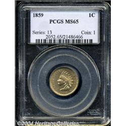 <B>1859<1C> MS65 PCGS.</B></I> Breen-1944. Sharply defined with golden-rose highlights in the fields. Close examination reveals some microscopic carbon flecks on both sides, but these are tiny indeed and do not detract from the overall appearance of the piece. The obverse shows some very slight rim crumbling, on the left side, but this appears to be "as struck," and may represent crushing of the upset rim when the coin was struck. A beautiful Gem, produced in the first year of issue for the very popular Indian Head cent series. <BR><BR><B>Important notice:</B> Heritage usually auctions material at the rate of 200-250 lots per hour. On some occasions eBay Live bid software or the Internet may not be able to keep up with the pace of the auction. We recommend placing a realistic absentee bid now as insurance to avoid disappointment. Occasionally the auctioneer may eliminate or reject an eBay Live bid, and the auctioneer may also reopen a lot after the close of the eBay live bidding (usually because we missed an audience bid), and may reject your bid even if it shows you as the winning bidder. By bidding via eBay Live, you agree that Heritage may award the lot to another bidder at its sole discretion under the circumstances described above or any other reasonable circumstances. Since eBay bids are not shown to us until we open the lot on the floor, we treat those bids just like floor bids. In most cases the floor responds before the eBay bid is presented to us, due to Internet lag time, so for consistency we have made it a policy that floor bids are always considered first over tie eBay live bids. Also please note that all Heritage lots purchased through eBay Live carry a 20% Buyer's Premium. Please make sure you read the Terms and Conditions before you bid. </span></font></tr></table></td></tr></table>