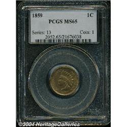 <B>1859<1C> MS65 PCGS.</B></I> Always of interest to both type and date collectors as this design was only struck in this one year. The 1859 is not usually as plentiful as one would think from the number of pieces consigned to this auction, this is an especially attractive Gem. Bright honey-golden and reddish-golden color, the reverse shows evidence of metal flow and both sides are well struck with no obvious or distracting blemishes on either side. <BR><BR><B>Important notice:</B> Heritage usually auctions material at the rate of 200-250 lots per hour. On some occasions eBay Live bid software or the Internet may not be able to keep up with the pace of the auction. We recommend placing a realistic absentee bid now as insurance to avoid disappointment. Occasionally the auctioneer may eliminate or reject an eBay Live bid, and the auctioneer may also reopen a lot after the close of the eBay live bidding (usually because we missed an audience bid), and may reject your bid even if it shows you as the winning bidder. By bidding via eBay Live, you agree that Heritage may award the lot to another bidder at its sole discretion under the circumstances described above or any other reasonable circumstances. Since eBay bids are not shown to us until we open the lot on the floor, we treat those bids just like floor bids. In most cases the floor responds before the eBay bid is presented to us, due to Internet lag time, so for consistency we have made it a policy that floor bids are always considered first over tie eBay live bids. Also please note that all Heritage lots purchased through eBay Live carry a 20% Buyer's Premium. Please make sure you read the Terms and Conditions before you bid.