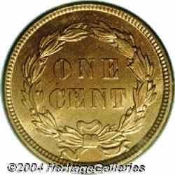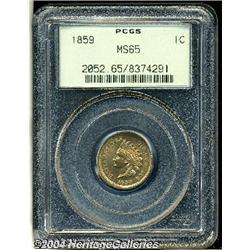 <B>1859<1C> MS65 PCGS.</B></I> Boldly detailed with appealing honey-tan coloration throughout and superior luster qualities. A couple of marks on the portrait's cheek and neck cause this attractive one-year type coin to just miss a finer grade status. Population: 108 in 65, 12 finer (9/04). <BR><BR><B>Important notice:</B> Heritage usually auctions material at the rate of 200-250 lots per hour. On some occasions eBay Live bid software or the Internet may not be able to keep up with the pace of the auction. We recommend placing a realistic absentee bid now as insurance to avoid disappointment. Occasionally the auctioneer may eliminate or reject an eBay Live bid, and the auctioneer may also reopen a lot after the close of the eBay live bidding (usually because we missed an audience bid), and may reject your bid even if it shows you as the winning bidder. By bidding via eBay Live, you agree that Heritage may award the lot to another bidder at its sole discretion under the circumstances described above or any other reasonable circumstances. Since eBay bids are not shown to us until we open the lot on the floor, we treat those bids just like floor bids. In most cases the floor responds before the eBay bid is presented to us, due to Internet lag time, so for consistency we have made it a policy that floor bids are always considered first over tie eBay live bids. Also please note that all Heritage lots purchased through eBay Live carry a 20% Buyer's Premium. Please make sure you read the Terms and Conditions before you bid.