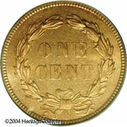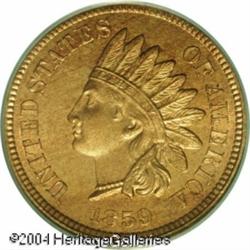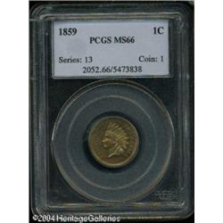 1859 1C MS66 PCGS. A truly breathtaking example of <B>1859 1C MS66 PCGS.</B></I> A truly breathtaking example of this consistently popular issue, and certainly deserving of its position among the finest known for the date. Graced with a needle-sharp and very bold strike, the surfaces are pristine except for a pair of unobtrusive nicks on the Indian's features and some trivial chatter in the fields. Lightly frosted devices are framed by flashy, mildly reflective fields, and cool orange-gold surfaces are accented by broad, vivid areas of crimson and magenta throughout as well as traces of watery sapphire and sea-green at the rims. Population: 13 in 66, 0 finer (10/04). <BR><BR><B>Important notice:</B> Heritage usually auctions material at the rate of 200-250 lots per hour. On some occasions eBay Live bid software or the Internet may not be able to keep up with the pace of the auction. We recommend placing a realistic absentee bid now as insurance to avoid disappointment. Occasionally the auctioneer may eliminate or reject an eBay Live bid, and the auctioneer may also reopen a lot after the close of the eBay live bidding (usually because we missed an audience bid), and may reject your bid even if it shows you as the winning bidder. By bidding via eBay Live, you agree that Heritage may award the lot to another bidder at its sole discretion under the circumstances described above or any other reasonable circumstances. Since eBay bids are not shown to us until we open the lot on the floor, we treat those bids just like floor bids. In most cases the floor responds before the eBay bid is presented to us, due to Internet lag time, so for consistency we have made it a policy that floor bids are always considered first over tie eBay live bids. Also please note that all Heritage lots purchased through eBay Live carry a 20% Buyer's Premium. Please make sure you read the Terms and Conditions before you bid. This lot is being auctioned in conjunction with a live floor auction by Heritage Galleries & Auctioneers. All final auction and invoice information will be supplied by Heritage Galleries & Auctioneers, and all other information should be considered preliminary. Lot:5073