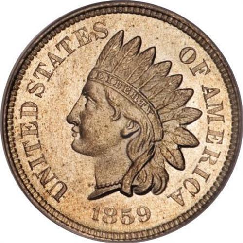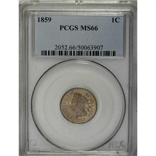 <B>1859 1C MS66 PCGS.</B></I> An important Premium Gem of this always-needed one-year type. Sharply struck with full definition on the diamonds. The lustrous surfaces display a light golden-tan patina and the fields have a confirmed semi-prooflike glimmer on each side. A few unobtrusive marks in the upper left obverse and upper reverse fields do not distract in the least from the great eye appeal of this one-year type coin. Population: 15 in 66, 0 finer (3/08).<BR><BR><B>Coin Engraver:</B> James B. Longacre<BR><BR><b>Shipping:</b> Coins & Currency (<a target="_blank" href="http://www.heritageauctions.com/common/shipping.php">view shipping information</a>)