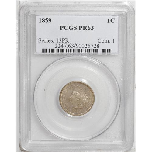1859 1C PR63 PCGS. A razor-sharp proof that has dusky