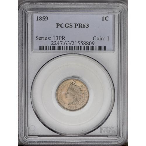 <B>1859<1C> PR63 PCGS.</B></I> A sharply struck tan-gold specimen that exhibits a few wispy hairlines. The Laurel Wreath type was struck for circulation only in 1859, and although business strikes are common, proofs are scarce.<BR><I>From The Empire Tree Collection.</B></I>