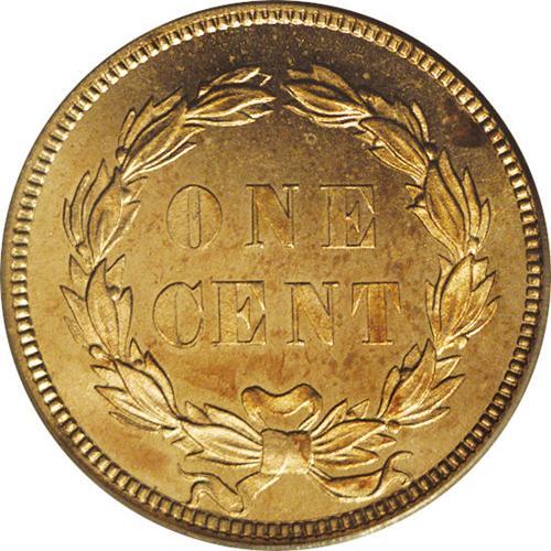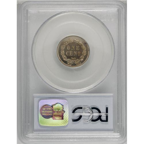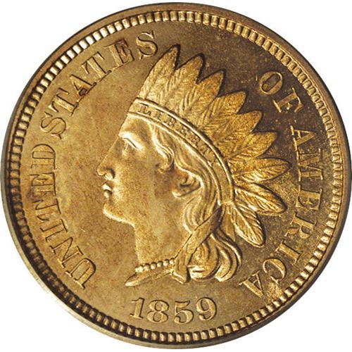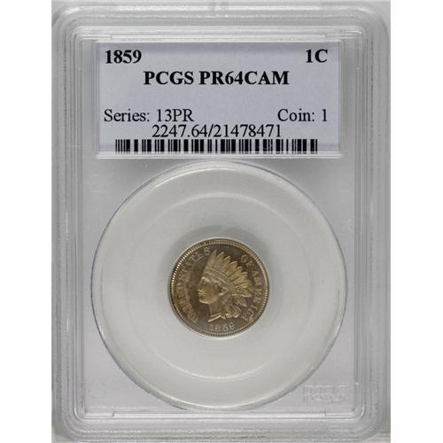 <B>1859<1C> PR64 Cameo PCGS.</B></I> A sharply struck proof example of the first Indian cent issue with light tan surfaces. The fields are fully mirrored around lustrous devices. A few splashes of deeper gold color can be seen on each side, and minor corrosion keeps this example from a higher grade.