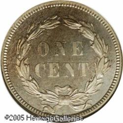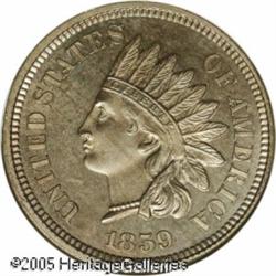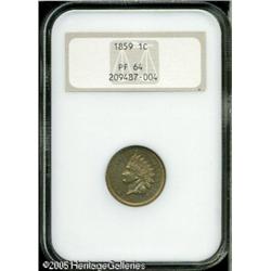 <B>1859 1C PR64 NGC.</B></I> While the 1859 may not be the rarest proof Indian Cent at the PR64 level of preservation, it is certainly among the most popular. This first-year issue is the only one in the series for which the reverse displays a laurel wreath. The present specimen is sharply struck throughout with blushes of russet intermingled with golden-tan color. Uniformly reflective with a little light haziness and some scattered toning streaks preventing a full Gem rating. Lot:5266