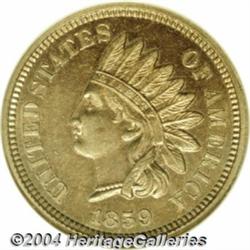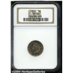 <B>1859<1C> PR64 NGC.</B></I> Of the 800 pieces reportedly struck, it is believed that this issue is far rarer than the mintage suggests. Many proofs either entered circulation or were melted at the end of the year. The fields are nicely reflective, the overall surfaces are moderately toned, and the design elements show the pinpoint striking details only seen on proofs. Population: 78 in 64, 55 finer (6/04). <BR><BR><B>Important notice:</B> Heritage usually auctions material at the rate of 200-250 lots per hour. On some occasions eBay Live bid software or the Internet may not be able to keep up with the pace of the auction. We recommend placing a realistic absentee bid now as insurance to avoid disappointment. Occasionally the auctioneer may eliminate or reject an eBay Live bid, and the auctioneer may also reopen a lot after the close of the eBay live bidding (usually because we missed an audience bid), and may reject your bid even if it shows you as the winning bidder. By bidding via eBay Live, you agree that Heritage may award the lot to another bidder at its sole discretion under the circumstances described above or any other reasonable circumstances. Since eBay bids are not shown to us until we open the lot on the floor, we treat those bids just like floor bids. In most cases the floor responds before the eBay bid is presented to us, due to Internet lag time, so for consistency we have made it a policy that floor bids are always considered first over tie eBay live bids. Also please note that all Heritage lots purchased through eBay Live carry a 20% Buyer's Premium. Please make sure you read the Terms and Conditions before you bid. </span></font></tr></table></td></tr></table>